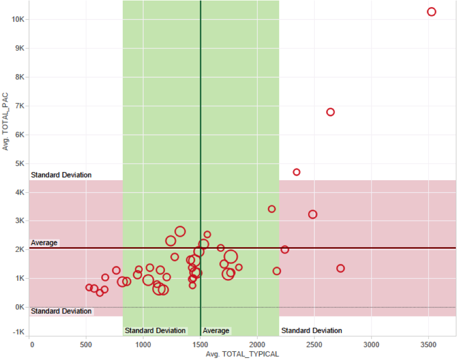 1) PROMETHEUS Analytics separates costs of “typical” care from costs associated with potentially avoidable complications, or PACs. PACs, at the core, are events that negatively impact patients and are controllable by providers. The separation of PAC from Typical costs creates performance comparisons of providers as a high PAC rate can be an indicator of low quality whereas a low PAC rate can be associated to high quality care. For example, the following graph shows specific providers, represented by bubbles, and their average costs of PACs and Typical care for a specific episode. Providers in the lower left quadrant are both more efficient and higher quality.